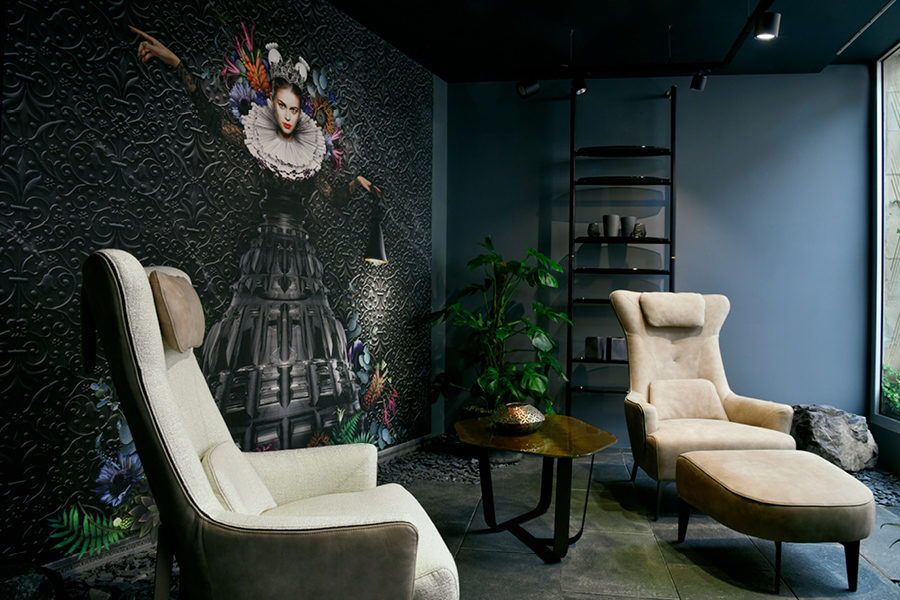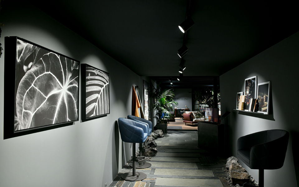 LEATHER SOFAS, ARMCHAIRS WITH HIGH-END UPHOLSTERY, MARBLE AND METAL COFFEE TABLES AND DECORATIVE ACCESSORIES, WILL CREATE A SCENOGRAPHY OF OVER 110 M2 THAT INVITES TO LUXURY AND IMMERSIVE RELAXATION.