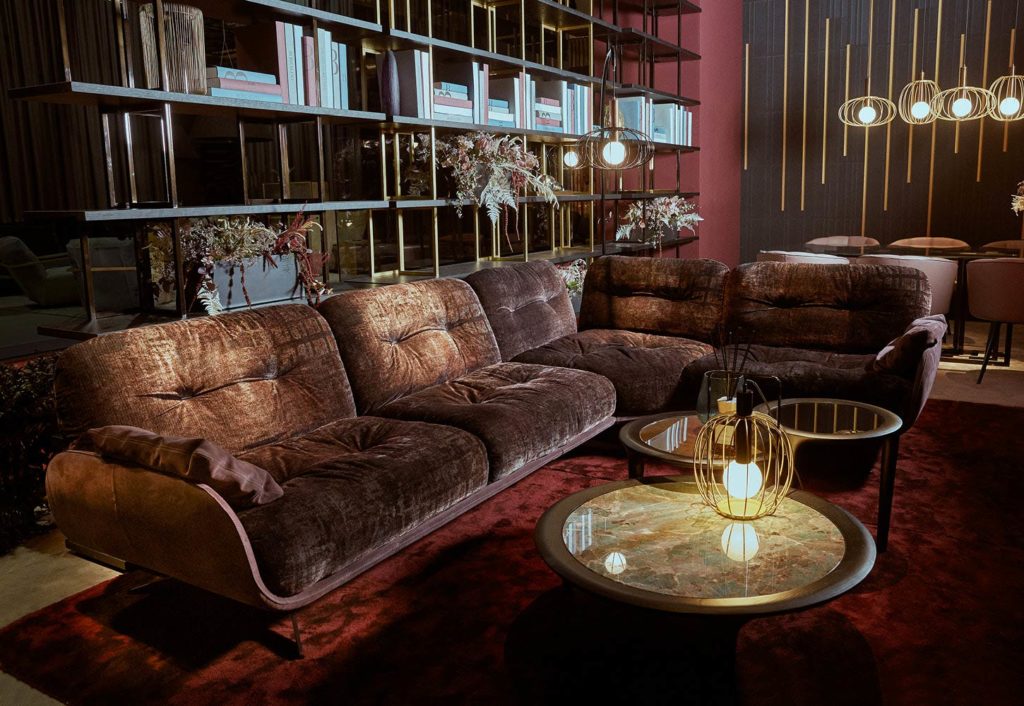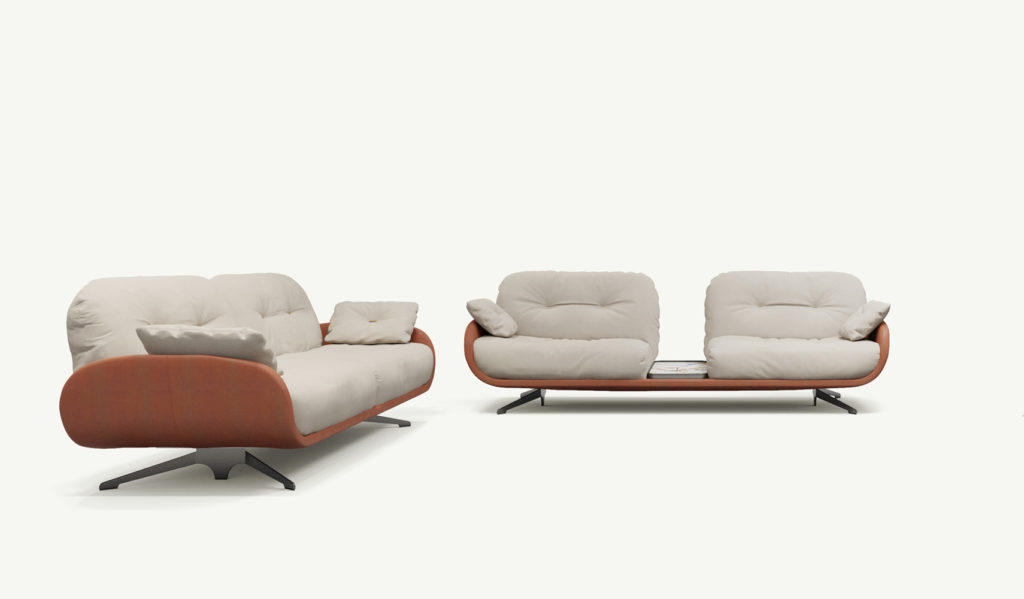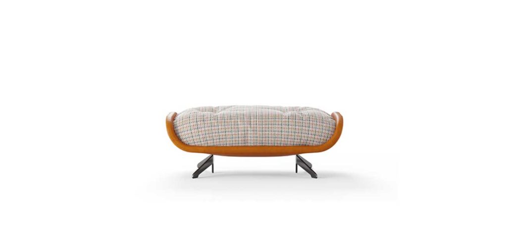 POUF THAT IS PART OF THE AYTON SEATING SYSTEM WHERE PAST AND PRESENT, TRADITION AND INNOVATION COMBINE GENERATING CONTRASTING SENSATIONS: THE STRICT LINES OF THE SUPPORT CONTRAST WITH THE SOFT CURVES OF THE UPHOLSTERY, THE SMOOTH SURFACES COMBINE WITH SOFT FABRICS, AND THE MOST PRECIOUS LEATHERS WITH REFINED YARNS. THE AUSTERITY OF THE FRAME, INSPIRED BY NORDIC GEOMETRIES OF THE ’50S, FADES INTO THE INFORMAL COMFORT OF THE CONTEMPORARY SEAT. LIKE A FLYING CARPET, THE STRUCTURE RISES FROM THE GROUND IN A HORIZONTAL PLANE AS IF IN A SHELL THAT ENCLOSES A SOFT AND WELCOMING HEART. AYTON IS A FULLY MODULAR COMPOSITION OF SEATS AND SHELFS THAT NATURALLY ADAPTS TO EVERY SPACE, FROM DOMESTIC TO PUBLIC.