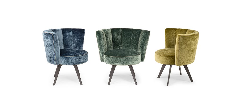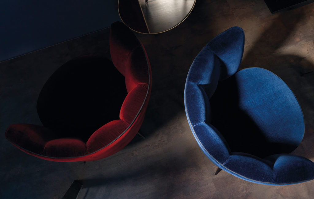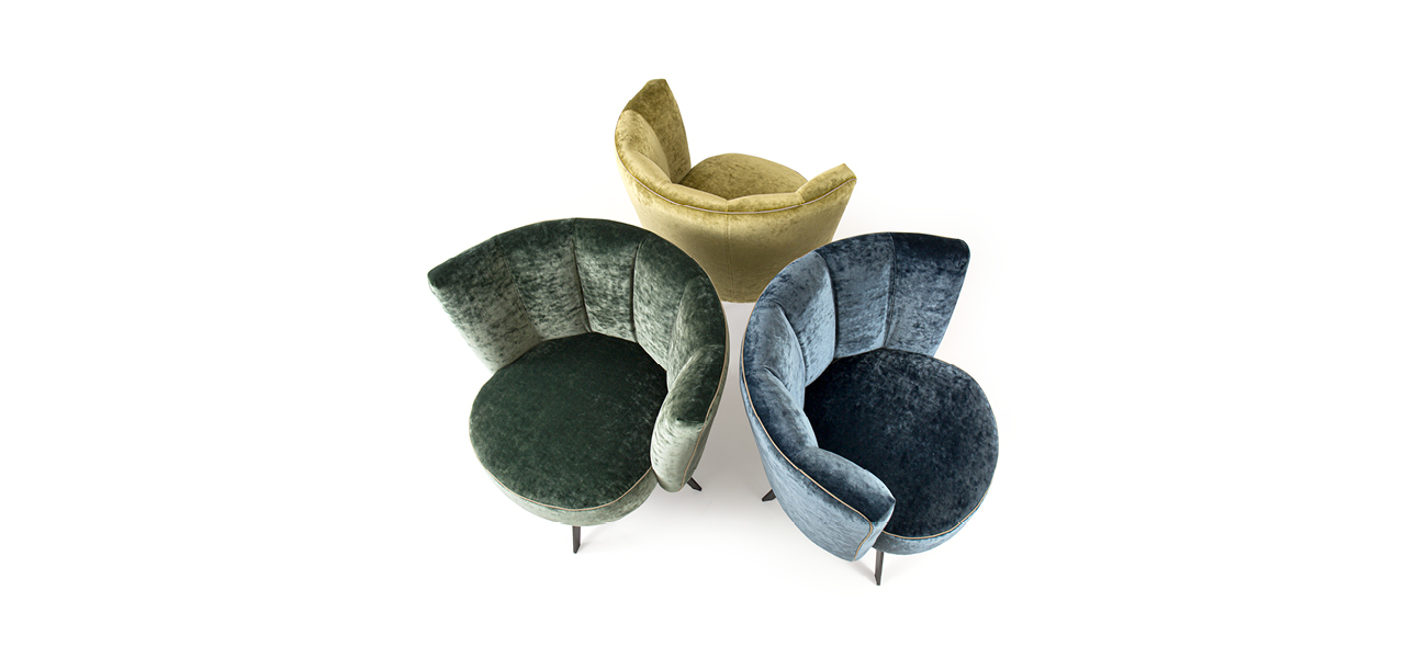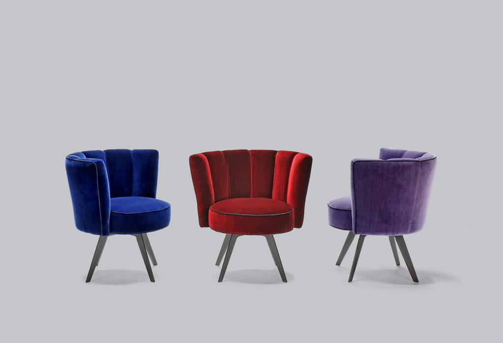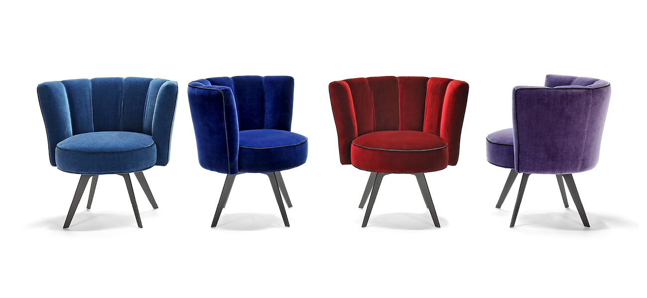 THE ORIGINAL AND DECORATIVE LINES OF ART DECO CHARACTERISE THIS SMALL ARMCHAIR WITH A WRAPAROUND BACKREST, CREATIVELY SHAPED LIKE A SHELL. THE REVOLVING ONE IS IDEAL FOR TEA-TIME OR CONVERSATION, THE FIXED VERSION IS PERFECT FOR A WAITING ROOM. DIVA CAN ALSO BECOME A DINING CHAIR, A STOOL OR A SMALL SOFA.