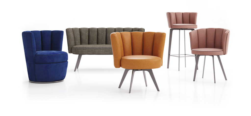 DERIVED FROM THE DIVA CHAIR, THIS STOOL IS ELEGANT THANKS TO ITS SHELL-SHAPED SHELL, BUT SUITABLE FOR MODERN AND CONTEMPORARY ENVIRONMENTS GIVEN THE COMBINATION WITH ITS PAINTED IRON STRUCTURE.