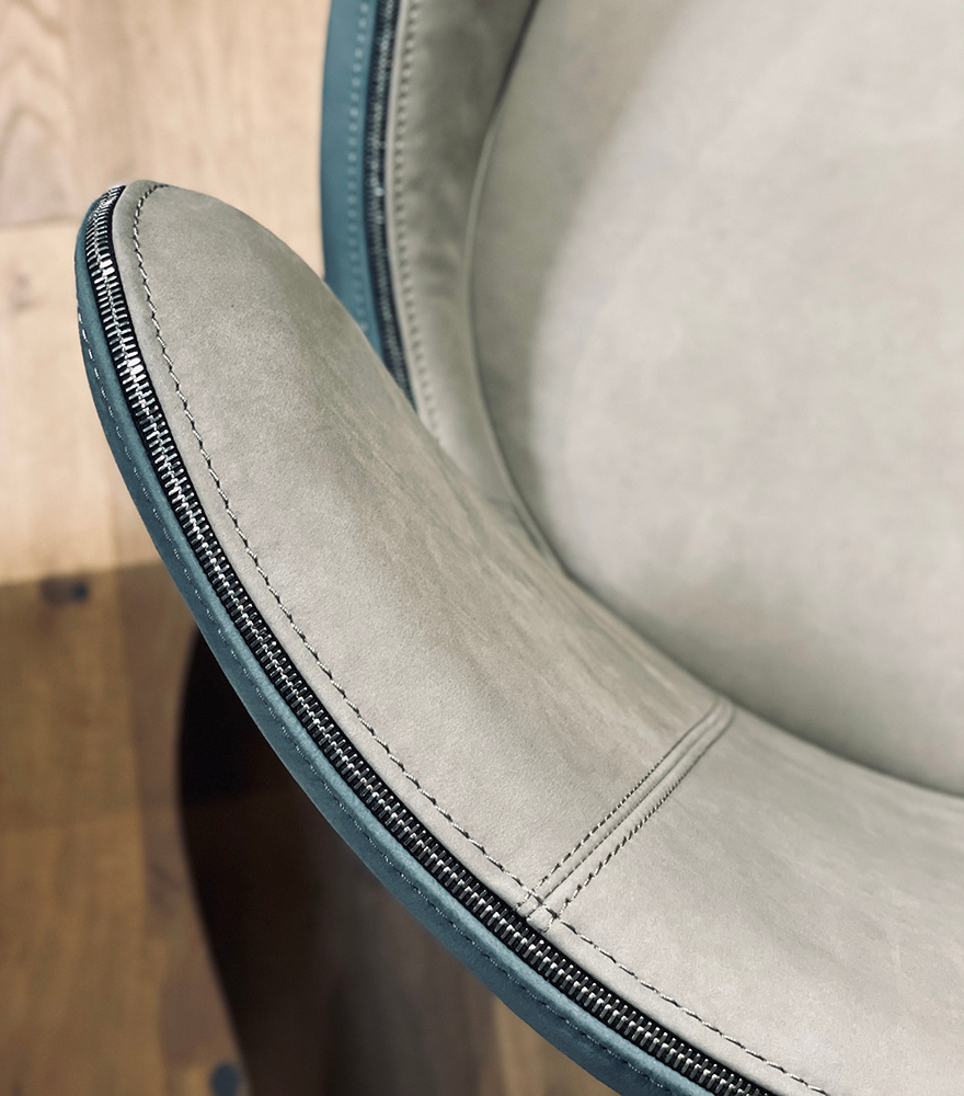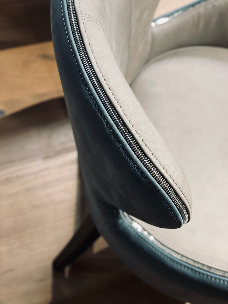 A CHAIR WITH SINUOUS, UNIQUE AND FASCINATING CURVES. IT WRAPS AND WELCOMES THE BACK IN A PERFECT WAY. A ZIP OUTLINES THE SHAPES AND GIVES A UNIQUE TOUCH OF ITS KIND.